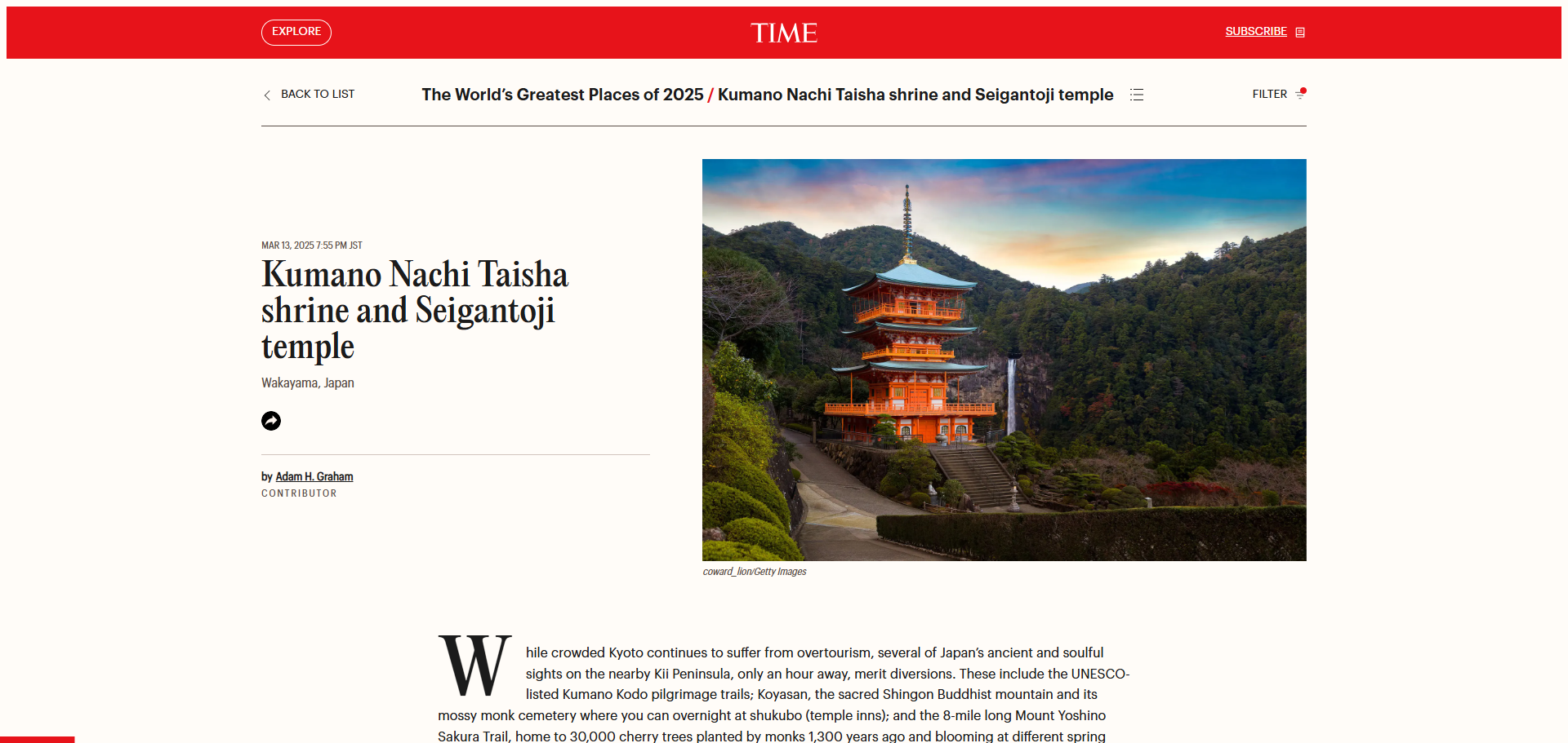 Le sanctuaire Kumano Nachi Taisha et le temple Seigantoji ont été sélectionnés parmi les « Meilleurs Endroits du Monde 2025 », annoncés par le prestigieux magazine américain « TIME » !